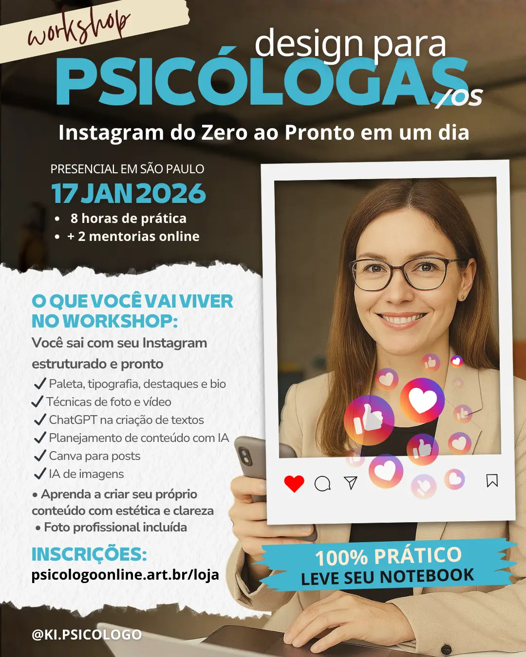 Estão abertas as inscrições para o Workshop Intensivo de Instagram para Psicólogas/os e profissionais da saúde — um encontro 100% prático para quem deseja começar o ano organizando seu perfil profissional, produzindo conteúdo por si mesmo com mais estética, clareza visual e autenticidade, mesmo sem saber nada sobre design gráfico, edição ou inteligência artificial.